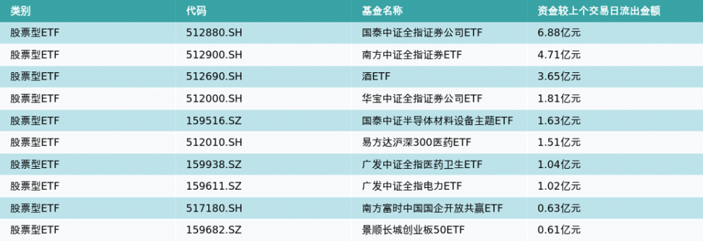 昨日股票型ETF资金流出最多的3支ETF及其流入金额分别为:国泰中证全指证券公司ETF(流出6.88亿元)、南方中证全指证券ETF(流出4.71亿元)、酒ETF(流出3.65亿元)。资金流出前10详情见下表:
