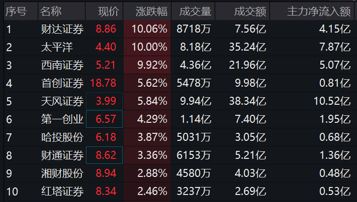 8月1日,证券板块低开,随后快速拉升翻红,相关指数方面,中证全指证券公司指数(399975.SZ)低开高走。成份股普涨,截至发稿,财达证券、西南证券涨停,太平洋录得6天5板,首创证券、天风证券等股跟涨。50只成份股48股上涨。