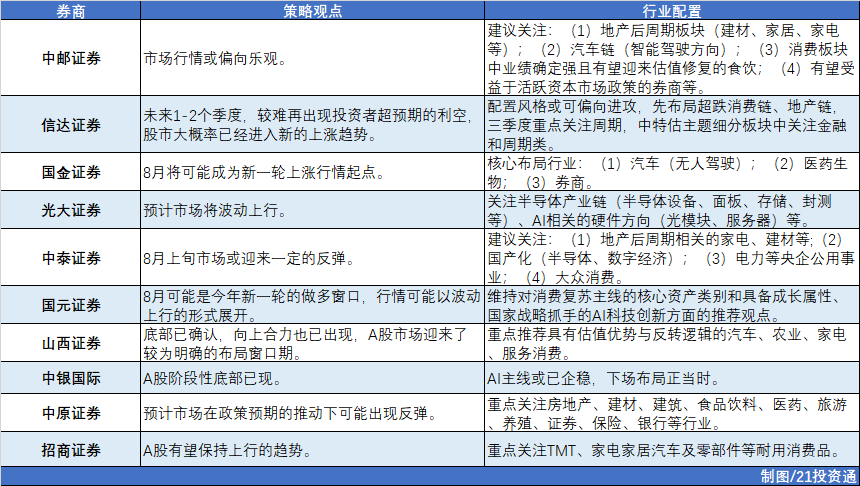 如此,8月接下来还会演绎怎样的行情?机构看好的“金股”有哪些?又给出了哪些配置建议?接下来,我们一起来看看。