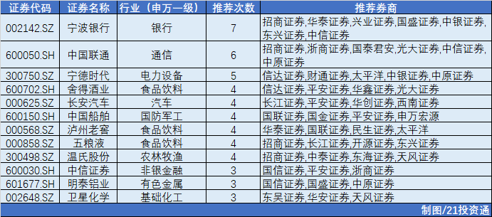 在统计的30余家券商金股中,被“点名次数”超过5次的有两只:宁波银行、中国联通。宁德时代则被推荐了5次。
