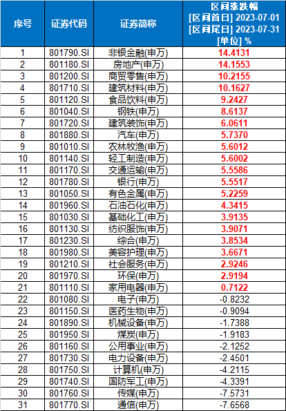 中邮证券认为,市场行情或偏向乐观。7月初市场受经济数据环比改善明显上涨,而后指数在美联储加息预期升温、前期强势的科技板块持续调整下出现震荡回落。月末受政治局政策利好刺激,金融与地产板块大幅上涨,带动指数强势上攻。展望后市,从政策面来看,政治局会议整体政策基调偏积极,明确提出活跃资本市场,有效提振了市场风险偏好,后面具体政策落地仍值得期待。