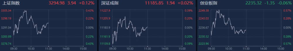 A股上午缩量震荡,三大指数涨跌不一。南财金融终端显示,截至上午收盘,上证指数涨0.12%,深证成指涨0.02%,创业板指跌0.06%。沪深两市个股跌多涨少,超2900只个股下跌。