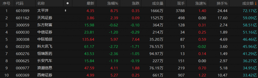 沪深两市半天成交额6265亿元,较上一交易日同期缩量1144亿元。个股方面,截至午间收盘,太平洋成交额排名第一,达72.17亿元;天风证券、东方财富、中信证券成交额也在50亿元以上,分别为59.09、58.51、51.16亿元。
