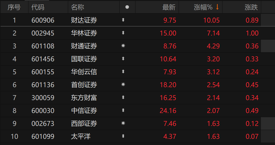 指数方面,中证全指证券公司指数(399975.SZ)高开高走,成分股多数上涨,财达证券涨停,华林证券涨超7%、财通证券、国联证券、华创云信、首创证券、东方财富、中信证券等跟涨。
