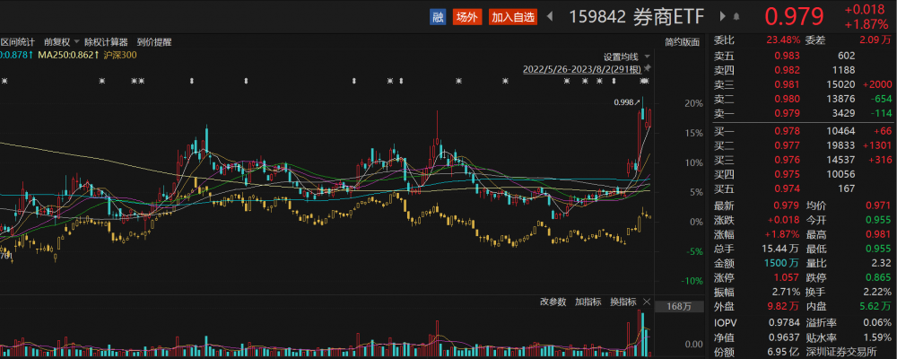 跟踪中证全指证券公司指数(399975.SZ)的券商ETF(159842)盘中走强,截至发稿,该ETF涨近2%,成交额超1500万元,换手率2.22%。截至8月1日,该ETF近10个交易日涨近12%。