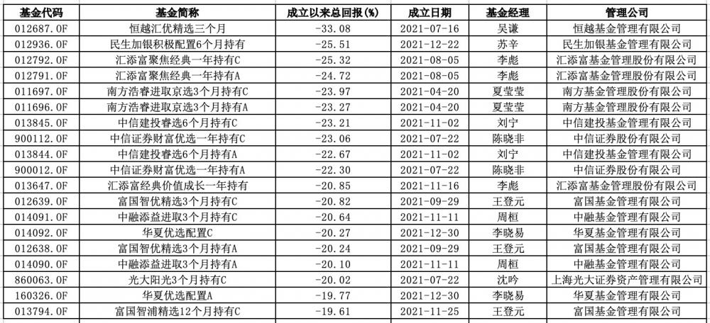 其中,天弘旗舰精选3个月持有、西藏东财均衡配置三个月持有、西部利得季季鸿三个月持有、汇添富聚焦价值成长三个月持有、汇添富积极投资核心优势三个月持有期等混合FOF基金今年以来亏损幅度超过6%。