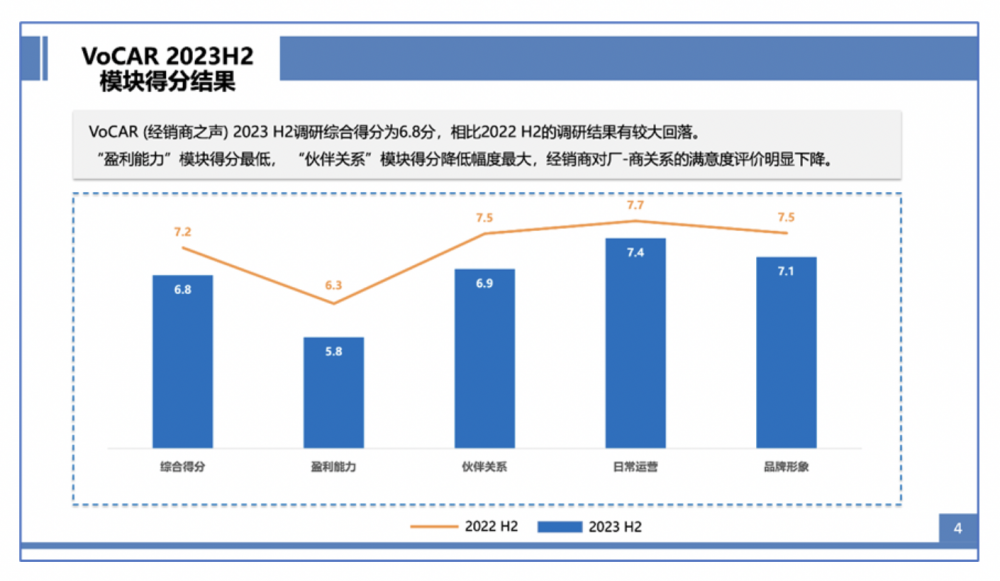 而中国汽车流通协会通过对全国58个品牌、303个经销商集团,4106个经销商单店回收的9721份有效调查问卷显示,“VoCAR 中国汽车经销商之声2023 H2 夏季版”综合得分为6.8分,相比2022 H2的调研结果有较大幅度回落。