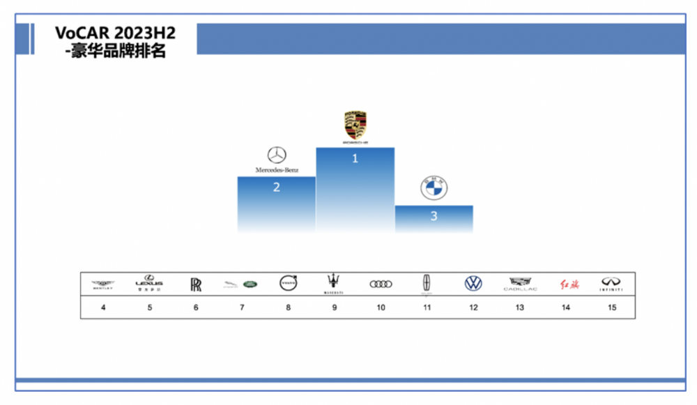 从细分市场来看,豪华品牌中保时捷综合得分排名第一,奔驰和宝马分列第二和第三名;和上期相比排名上升的品牌分别为进口大众、保时捷、宾利、玛莎拉蒂、奥迪。