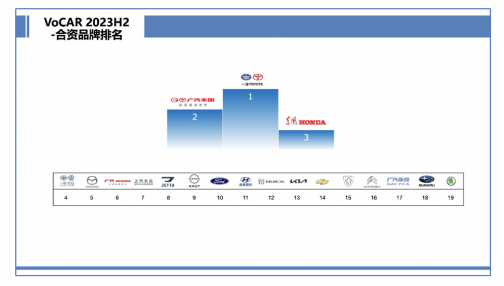 主流合资品牌中,一汽丰田排名第一,广汽丰田和东风本田分列第二和第三名。与上期相比排名上升的品牌分别为一汽-大众、一汽丰田、上汽大众、捷达和悦达起亚。