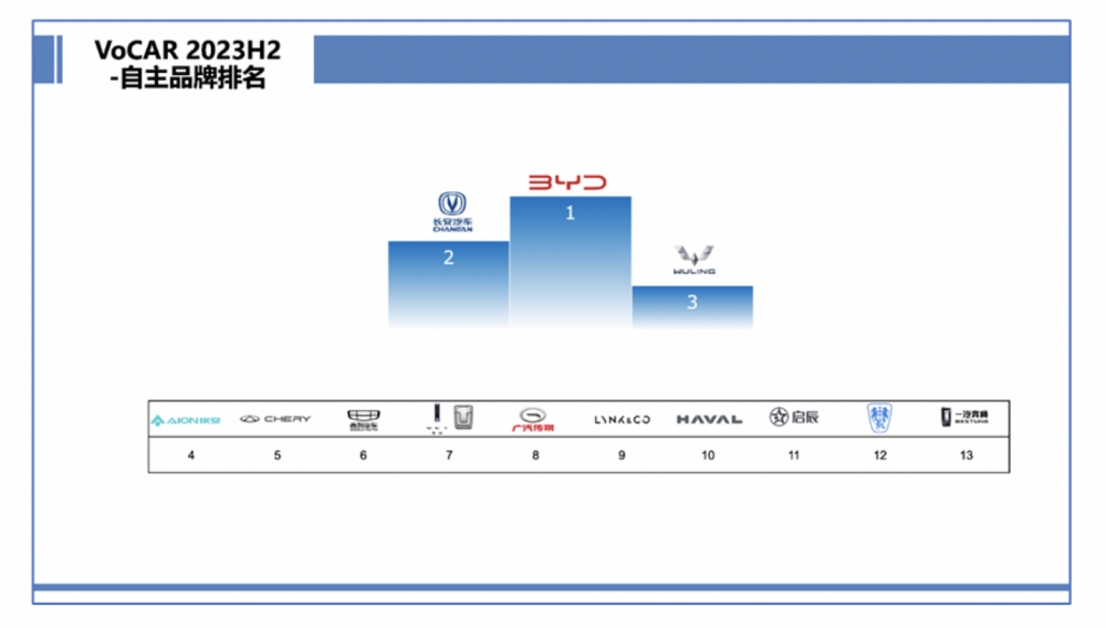 “比亚迪品牌是新能源的领跑者,在各细分市场都有较强竞争力的产品部署,已经成了消费者购买新能源汽车的第一优选品牌;长安这几年表现比较稳定,新能源和燃油车细分市场均有不俗的产品。”宋涛表示,和另外两个市场相比,自主品牌总体评价排名靠前的品牌呈现销售正增长的态势,自主品牌综合得分为6.6,相比上期有小幅的回升,高于主流合资品牌。