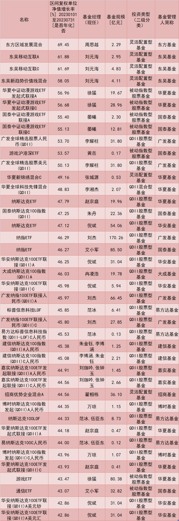 此外,广发全球精选股票人民币(QDII)、国泰游戏沪港深ETF在2023年前7个月收益超过50%。华夏全球科技先锋混合、华安纳斯达克ETF、泰信行业精选混合等多只基金在今年前7个月收益超过40%。