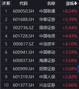 A股三大指数早盘集体飘红。电信运营、非银金融等部分价值类板块早盘大涨。截至发稿,价值股代表性指数沪深300价值指数 (000919)成分股中,中国联通涨超8%,华泰证券、国信证券涨超5%,中国电信、中油资本涨超4%,中国移动、海通证券、招商证券涨逾3%。