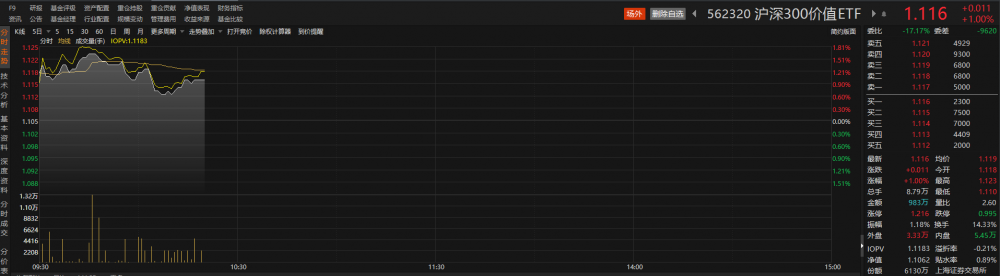 跟踪沪深300价值指数的沪深300价值ETF(562320)早盘高开后强势震荡,交投持续活跃。截至发稿,该ETF上涨1.00%,换手率高达14.33%。