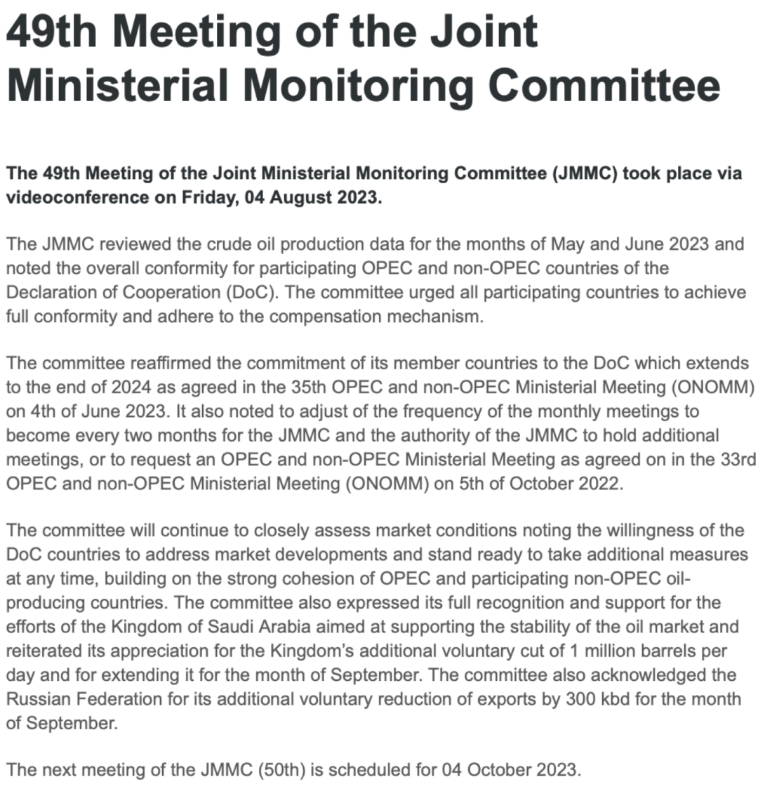 “欧佩克+”联合部长级监督委员会(JMMC)第49次会议当地时间8月4日召开。会议重申,遵循《合作宣言》及6月4日会议的决策(即:从2024年1月1日至2024年12月31日,欧佩克与非欧佩克产油国原油日产量调整为每天4046.3万桶)。会议强调,将密切关注市场动态,随时准备在“欧佩克+”强大凝聚力的基础上采取额外措施。