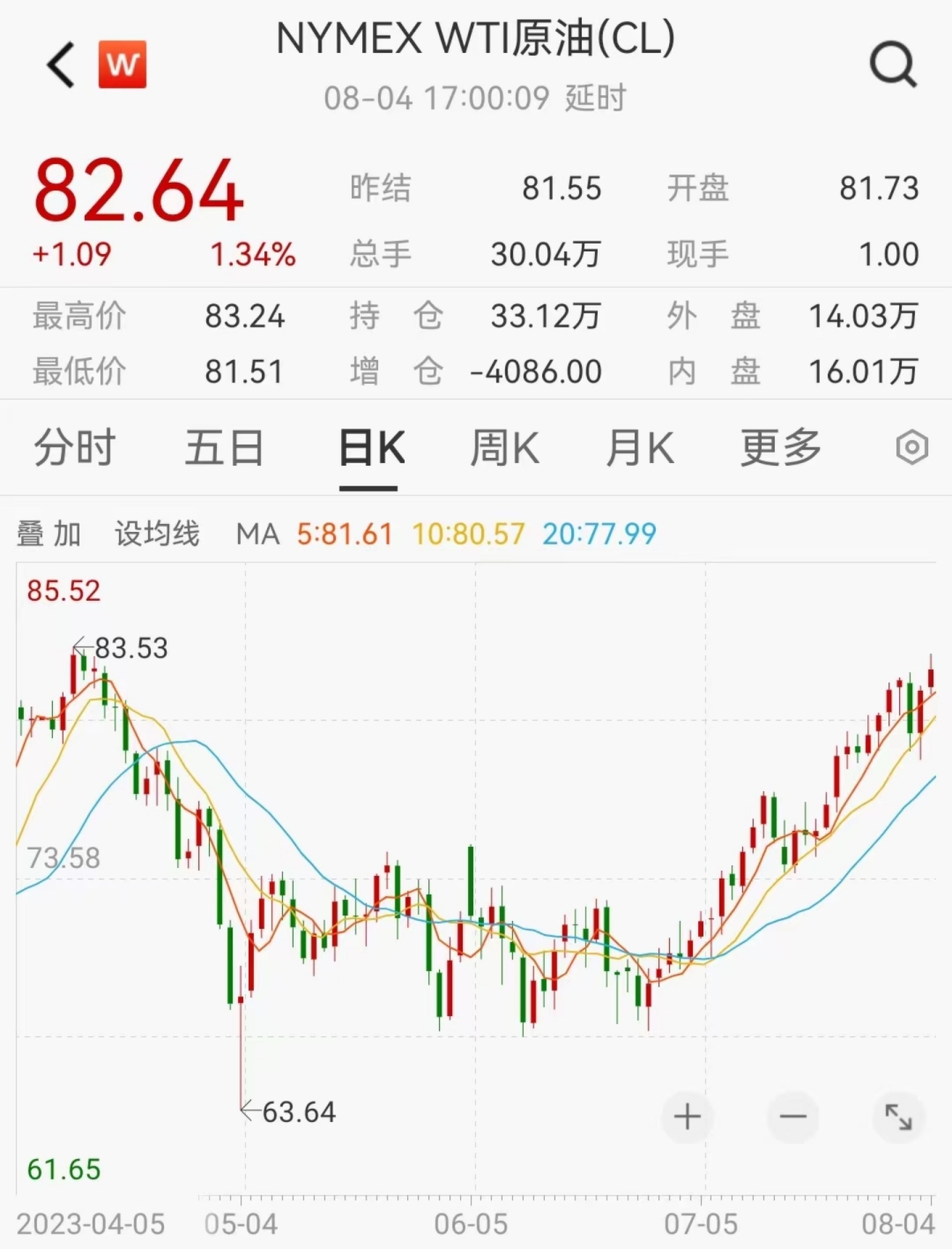 截至当地时间8月4日收盘,WTI原油收于82美元/桶上方,并实现了连续六周上涨,创下了近4个月的新高。
