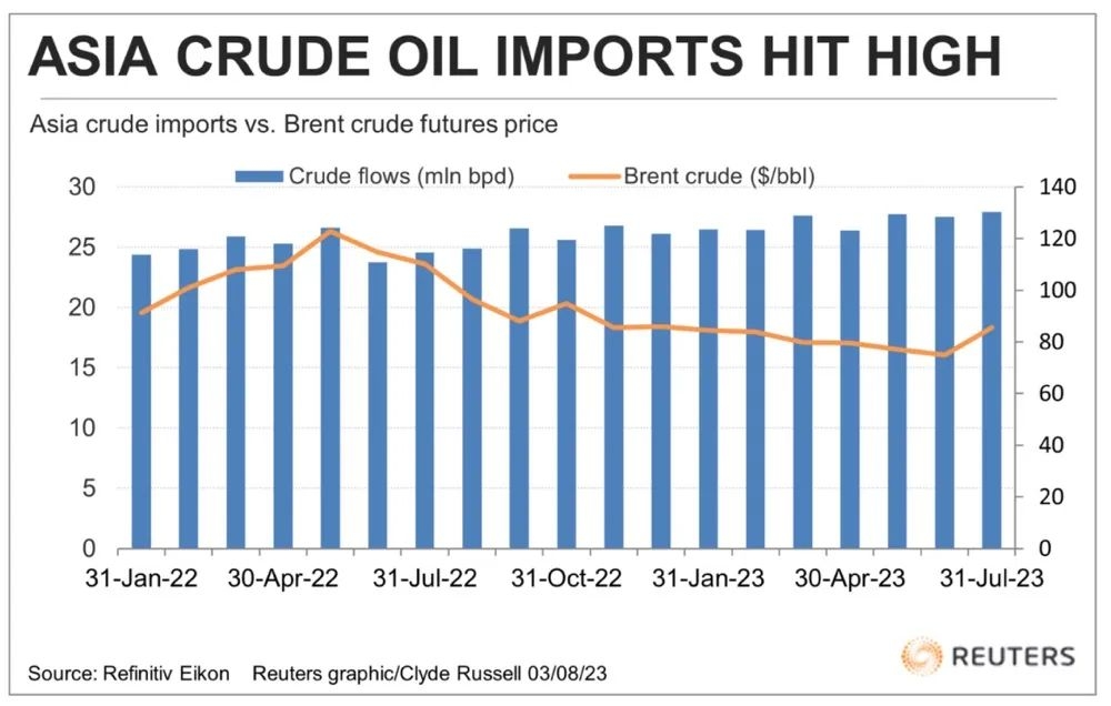 7月亚洲原油进口量继续升至创纪录的高位。作为该地区最大的两个原油进口国,中国和印度继续大量进口原油。