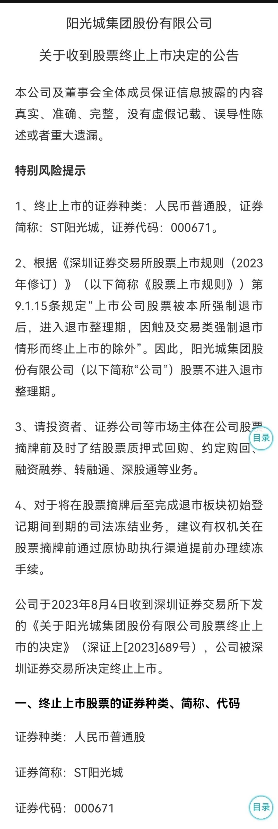8月4日晚,阳光城公告,于当日收到深圳证券交易所下发的《关于阳光城集团股份有限公司股票终止上市的决定》(深证上[2023]689号),公司被深交所决定终止上市。