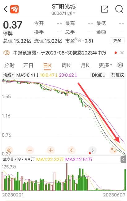 但在今年4月下旬开始,伴随整个板块的集体杀跌,阳光城最终也被“1元退市黑洞”吸了进去,5月5日开始连续跌停,到5月12日跌到0.58元时,基本就已宣告回天乏术,最终持续的跌停一直持续到6月9日停牌,其股价定格在了0.37元。