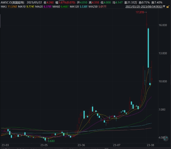 以美国超导(AMSC)为例,该股8月1日最高涨幅一度超过150%,最后收涨60%。随后8月2日和3日两个交易日,累计跌幅超过45%,在8月4日再度上涨超过7个百分点,盘中最大涨幅一度超过16%。