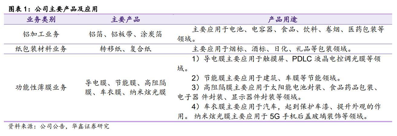 据官网,公司成立初期主要从事环保生态型纸制品印刷材料的研发、生产和销售业务;2012年后,通过收购及新设分公司等方式,公司先后在功能性薄膜、铝加工业务领域进行了布局。