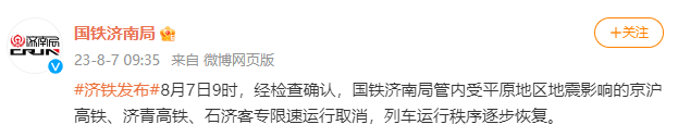 8月7日9时,经检查确认,国铁济南局管内受平原地区地震影响的京沪高铁、济青高铁、石济客专限速运行取消,列车运行秩序逐步恢复。