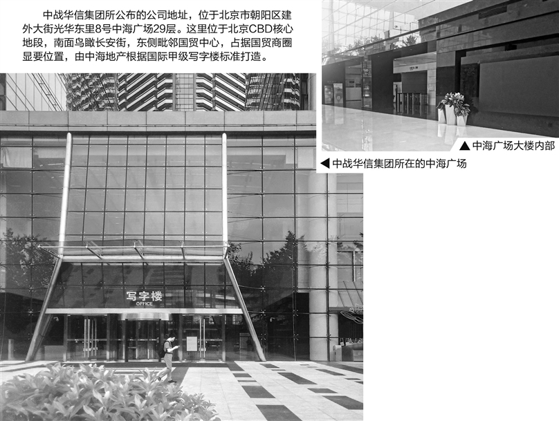 中战华信集团所公布的公司地址,位于北京市朝阳区建外大街光华东里8号中海广场29层。这里位于北京CBD核心地段,南面鸟瞰长安街,东侧毗邻国贸中心,占据国贸商圈显要位置,由中海地产根据国际甲级写字楼标准打造。