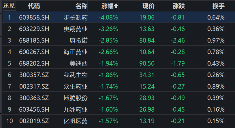 跌幅方面,步长制药跌超4%,奥翔药业跌超3%,康希诺、海正药业跌超2%,美迪西、我武生物、众生药业等跟跌。