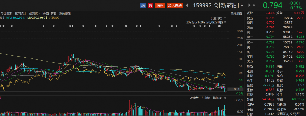 跟踪该指数的ETF中规模最大的创新药ETF(159992)早盘回升,但盘中现溢价交易。截至发稿,该ETF下跌0.13%,溢折率为0.04%,成交金额接近1亿元。