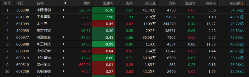 中际旭创成交额居首,为54.56亿元。其次是工业富联、太平洋、东方财富、浪潮信息,成交额分别为49.91亿元、49.72亿元、49.53亿元、46.35亿元。