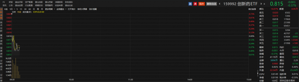 跟踪该指数的ETF中规模最大的创新药ETF(159992)早盘下跌,但盘中频现溢价。截至发稿,该ETF跌幅为0.37%,溢折率为0.01%,成交金额近3900万元。