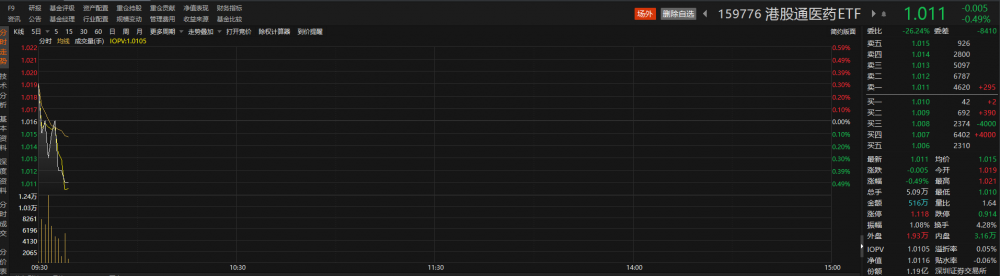 跟踪该指数的港股通医药ETF(159776)早盘高开低走,但盘中同样出现溢价。截至发稿,该ETF跌幅为0.49%,溢折率为0.05%。