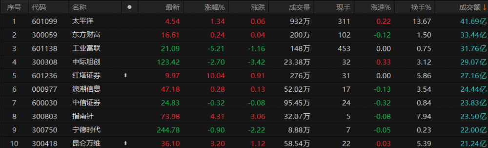 沪深两市半天成交额4202亿元,较上一交易日同期缩量349亿元。个股方面,截至午间收盘,太平洋成交额排名第一,达41.69亿元;东方财富、工业富联成交额也在30亿元以上,分别为33.44、31.76亿元。