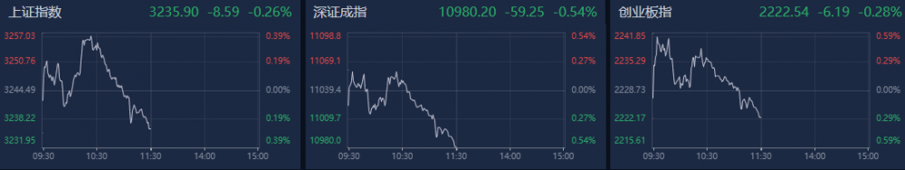 A股三大指数上午小幅冲高后震荡回落,午收前集体翻绿。南财金融终端显示,截至上午收盘,上证指数跌0.26%,深证成指跌0.54%,创业板指跌0.28%。沪深两市个股跌多涨少,超2700只个股下跌。