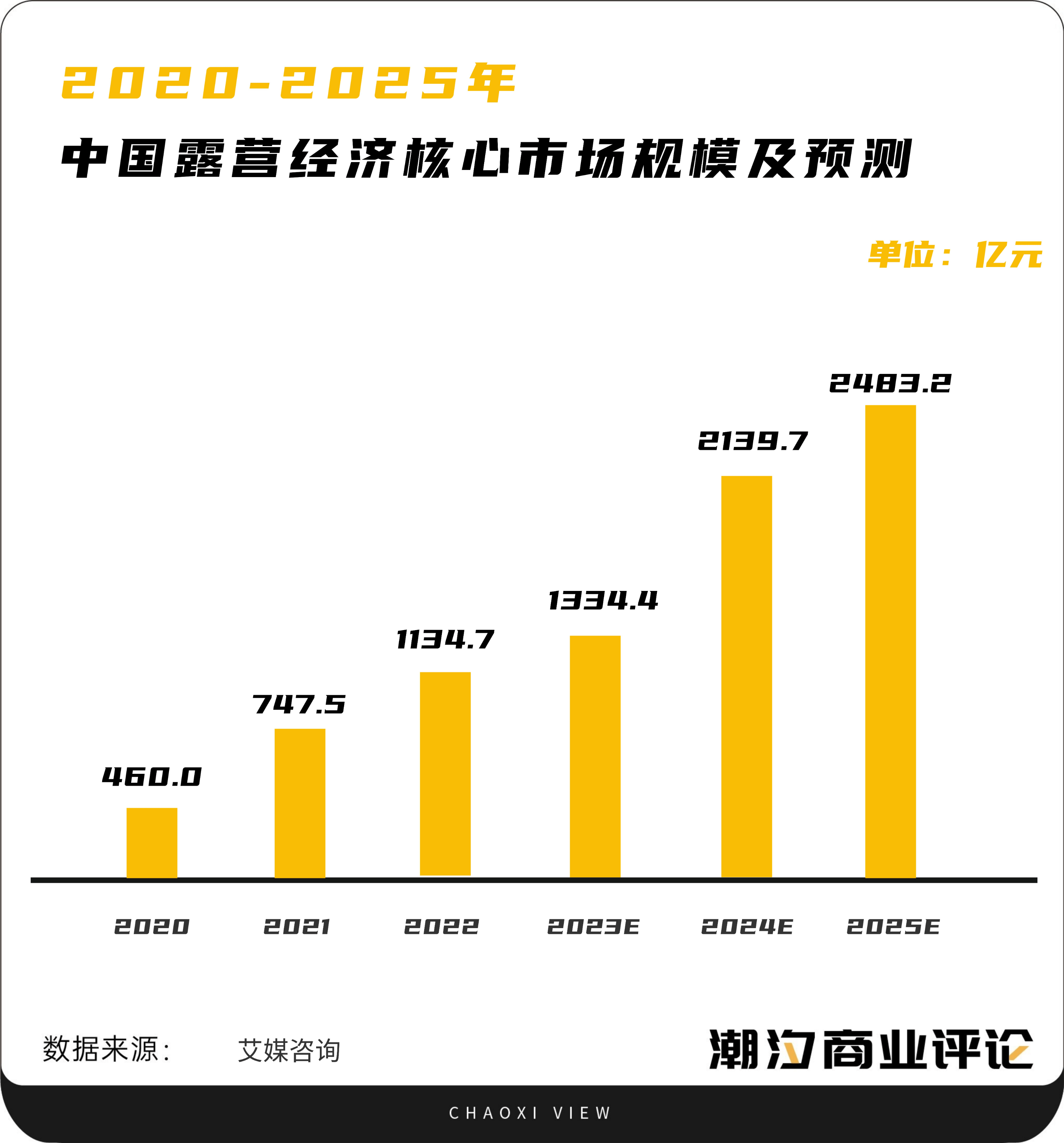 艾媒咨询数据显示,2021年,中国露营经济核心市场规模达到747.5亿元,同比增长62.5%;带动相关市场规模为3812.3亿元,同比增长59%。预计2025年,中国露营经济核心市场规模将上升至2483.2亿元,带动相关市场规模将达到14402.8亿元。