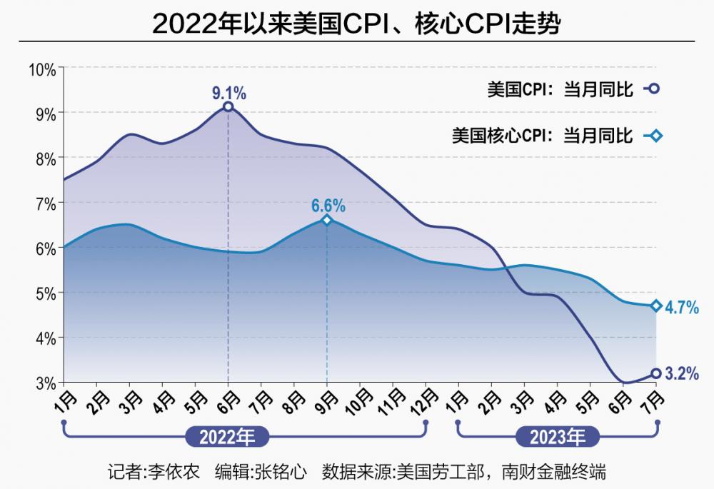 美国劳工部最新公布的通胀数据显示,美国7月CPI同比上升3.2%,略高于此前6月的升3%,呈小幅反弹趋势,止步于“12连降”,但低于预期的升3.3%。7月核心CPI同比上涨4.7%,延续回落趋势,涨幅较预期低0.1个百分点。