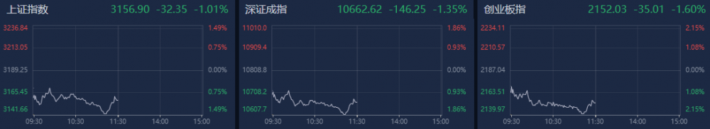 A股上午震荡调整,三大指数均跌超1%。南财金融终端显示,截至上午收盘,上证指数跌1.01%,深证成指跌1.35%,创业板指跌1.60%。沪深两市个股跌多涨少,超3600只个股下跌。