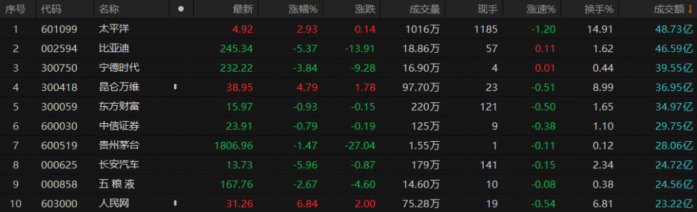 沪深两市半天成交额4603亿元,较上一交易日同期缩量65亿元。个股方面,截至午间收盘,太平洋成交额排名第一,达48.73亿元;比亚迪、宁德时代、昆仑万维、东方财富成交额也在30亿元以上,分别为46.59、39.55、36.95、34.97亿元。
