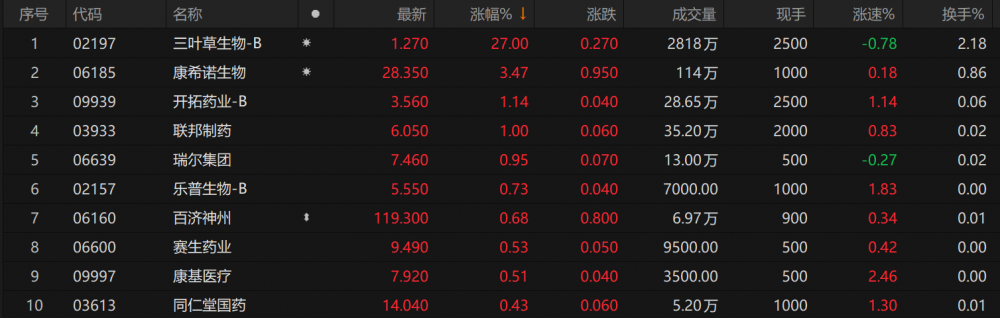 涨幅方面,截至发稿,三叶草生物-B涨27%。根据公告,该公司预计中期净利润不少于人民币5亿元,而去年同期则录得净亏损约人民币11.36亿元,同比扭亏为盈。此外,康希诺生物涨超3%,开拓药业-B、联邦制药、瑞尔集团、乐普生物-B等跟涨。