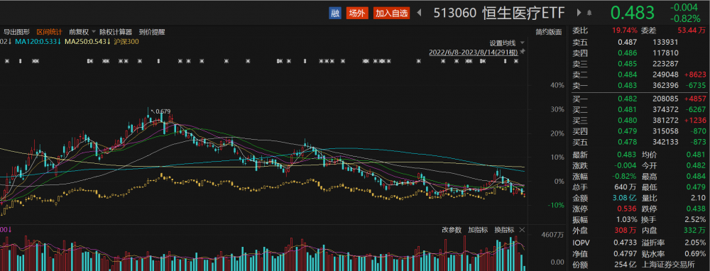 跟踪恒生医疗保健指数(HSHCI.HK)的恒生医疗ETF(513060)低开震荡,持续大幅溢价,截至发稿,该ETF跌0.82%,成交额突破3亿元,换手率2.52%,溢折率超2%。