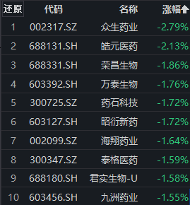 A股早盘集体走弱,截至发稿,三大指数均跌超1%。受大盘影响,医药板块走低。相关指数中,中证创新药产业指数(931152)50只成分股中多数出现下跌。其中众生药业跌近3%,皓元医药跌超2%,荣昌生物、万泰生物、药石科技、昭衍新药等多股跌逾1%;仅微芯生物、康希诺、科伦药业、华东医药4只个股逆势上涨。