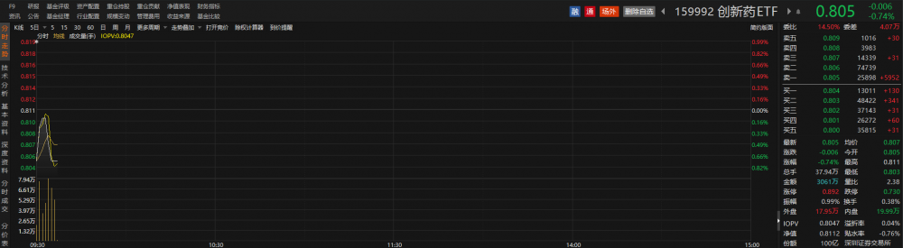 跟踪该指数的ETF中规模最大的创新药ETF(159992)早盘走低,但盘中频现溢价。截至发稿,该ETF跌幅为0.74%,溢折率为0.04%,成交金额超3000万元。
