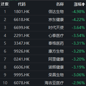 港股方面,医疗医药股同样多数下跌。相关指数中,中证港股通医药卫生综合指数 (930965) 盘中一度跌近2%。截至发稿,成分股中,信达生物、京东健康跌超4%,时代天使、心泰医疗、泰格医药、康方生物、阿里健康、诺辉健康、荣昌生物跌逾3%。