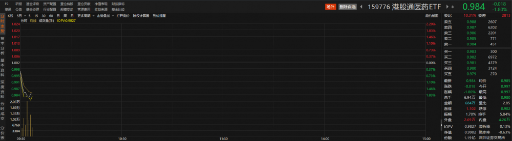 跟踪该指数的港股通医药ETF(159776)早盘走低,但盘中同样出现溢价。截至发稿,该ETF跌幅为1.80%,溢折率为0.13%。