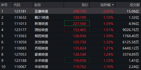 涨幅方面,亚康转债涨近3%,成交额超15亿元;友发转债、鹤21转债、豪美转债、新港转债等涨超1%。