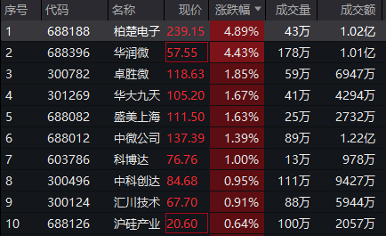 涨幅方面,柏楚电子、华润微涨超4%,卓胜微、华大九天、中微公司等股涨超1%。