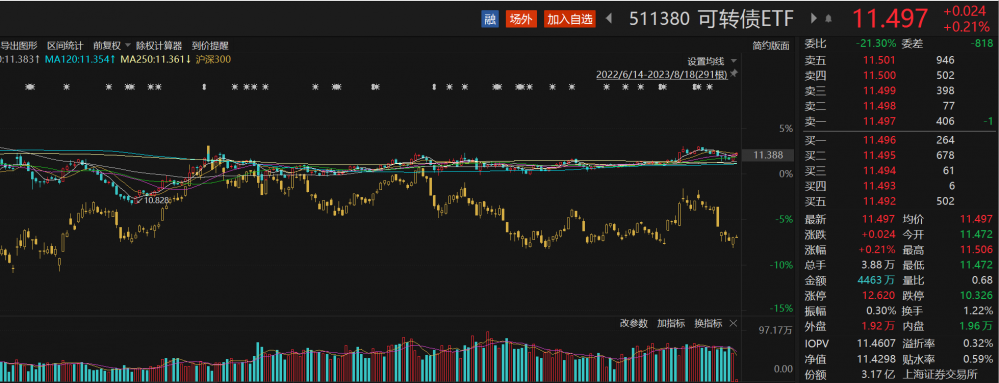 ETF方面,受行情影响,跟踪中证转债及可交换债指数的博时可转债ETF(511380)低开高走,现涨0.21%,盘中持续溢价,溢折率0.32%,成交额突破4400万元。
