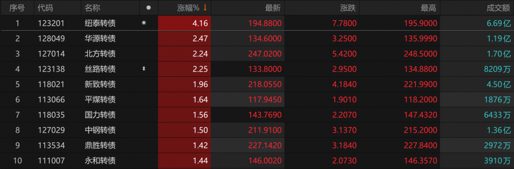 持仓债券涨多跌少,截至发稿,涨幅方面,纽泰转债涨超4%,华源转债、北方转债、丝路转债均涨超2%。跌幅方面,科思转债跌超3%,英特转债、润达转债跌超2%。