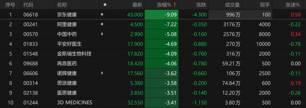 权重股包括京东健康和阿里健康的恒生医疗保健指数(HSHCI.HK)低开低走,成分股多数下跌,截至发稿,京东健康跌超9%,阿里健康跌超7%,中国中药、平安好医生、金斯瑞生物科技等跟跌。