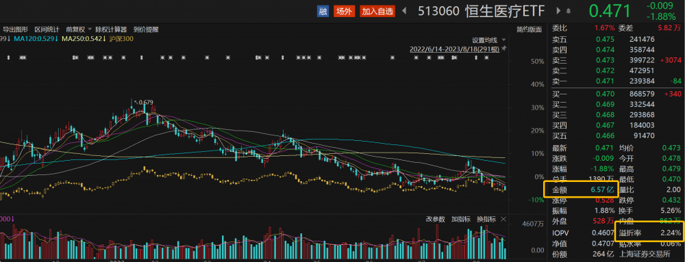 跟踪恒生医疗保健指数(HSHCI.HK)的博时恒生医疗ETF(513060)低开震荡下行,盘中持续大幅溢价。