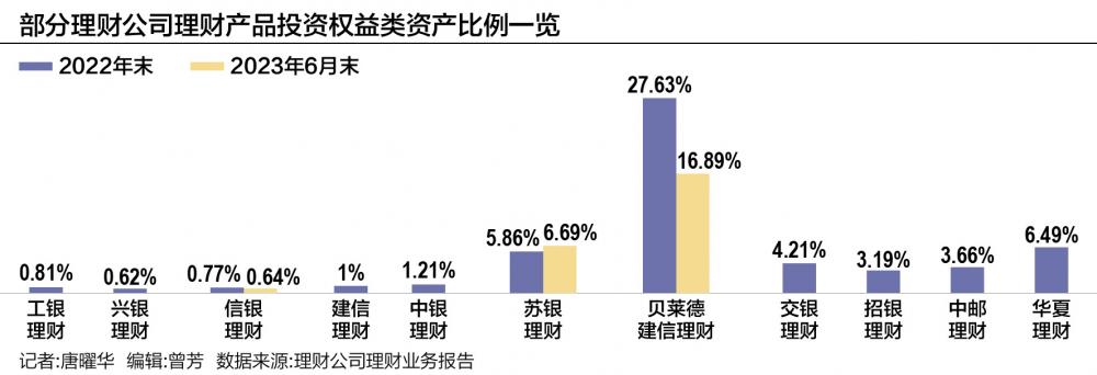 也有不少理财公司保持不低的比例投资权益类资产,比如2022年末农银理财全部理财产品资产持仓中,权益类资产占比5.72%。华夏理财存续理财产品投资权益类资产比例6.49%。苏银理财今年上半年将权益类资产投资比例进一步提高至6.69%。